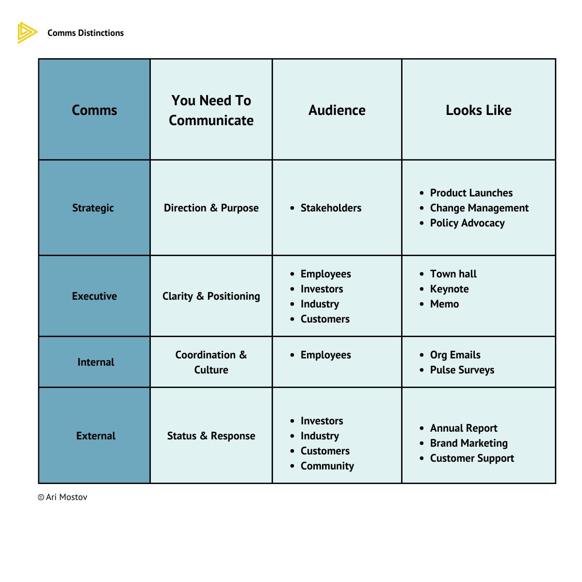 But let’s take a look at the different types of comms we’ll come across in an organization and the different audiences and purposes they serve.