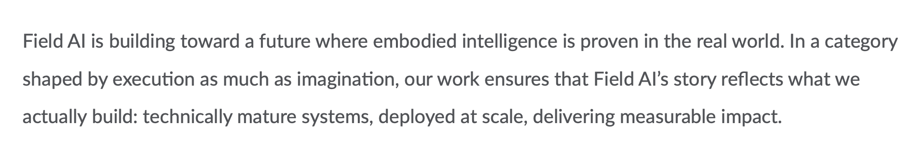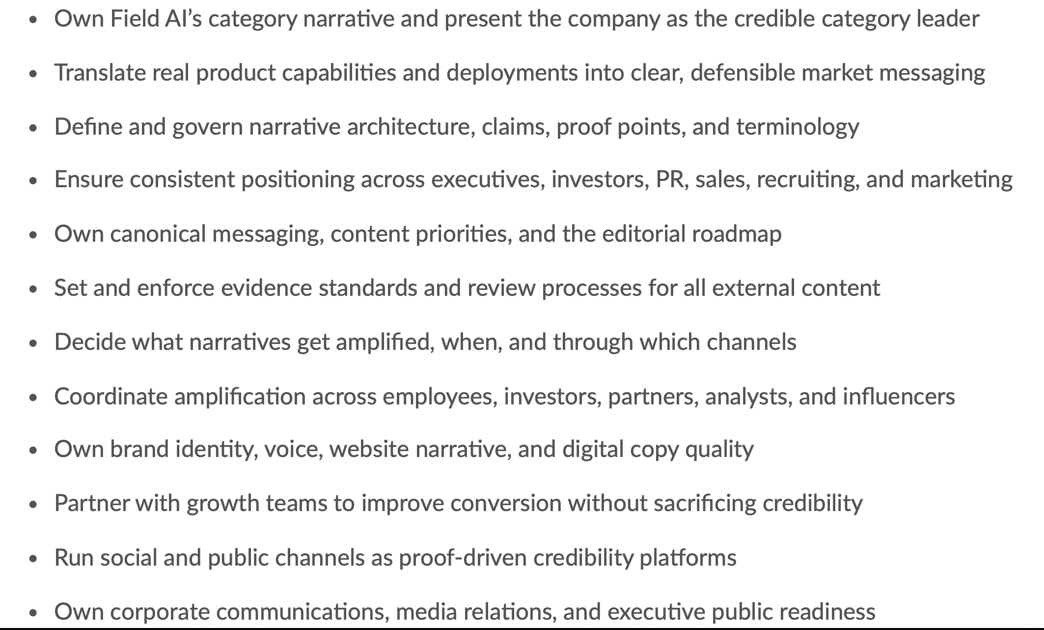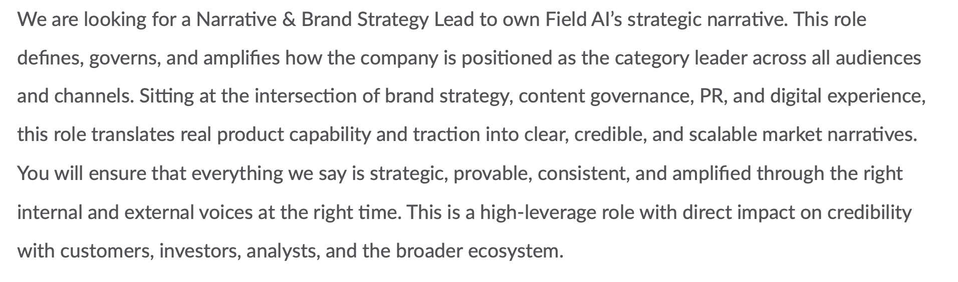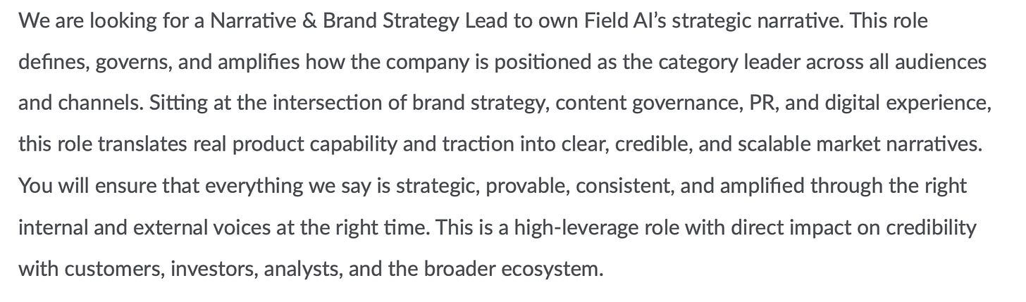 Oh my, this is just lovely. Mostly because this role describes a narrative strategist that has full 360 degree coverage of the narrative being stewarded. Narrative strategy works best when it’s leading across “all audiences and channels”. That means you’re stewarding the narrative not just from the C Suite (executive comms) or customer channels (marketing) — you’re championing the narrative across the whole business. When you have a systems level approach to storytelling, you’re able to identify how the language, story assets and communications are being used to achieve outcomes. Again, we’re seeing the emphasis on “credibility” and “governance” which speaks to high stakes, high responsibility environments that Field AI is likely operating in, such as energy, government response. The narrative needs for a company like Field AI are far more demanding than a typical B2C company, as the risks of miscommunications and misunderstanding can compound into serious adverse outcomes. Each communication, each story asset, is crafted and shared with astute attention and forethought — there’s no glib social media comments or off the cuff hot-mic moments. Field AI’s narrative is treated as mission-critical for it’s success.