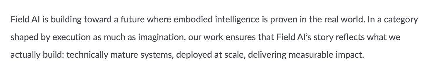 Quick call out - embodied intelligence is a category of AI focused on robots and machines. I’ve also seen it called “embodied AI” or “physical AI”. This isn’t another SaaS company or software darling — Field AI is building the machines that, until now, have only been read about in science fiction books.