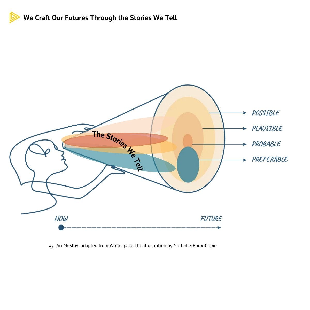 This compelling illustration, inspired by the “Cone of Futures,” shows how the stories we tell today influence the spectrum of futures we encounter tomorrow. It maps how our present narratives unfold into multiple layers of potential futures—possible, plausible, probable, and preferable.